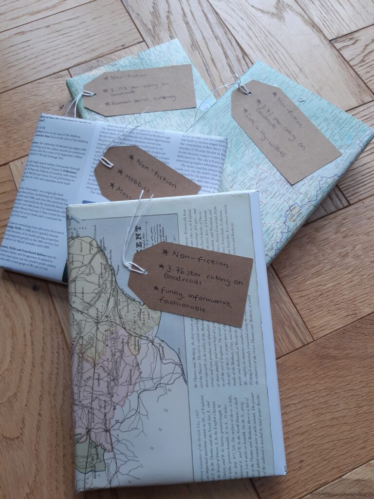 On Friday 28th November we will have a stall at Buntingford Christmas Market. Our ethos of reusing materials continues as we are selling ‘as new’ pre loved books, ready wrapped up (from old book pages) to give as Christmas presents or simply to treat yourself. Each book has a Good Reads rating and a few clues as to the genre of the book, but you don’t know what you are going to get.
